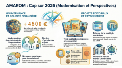 Évolution statutaire et gouvernance : L’association a modifié ses statuts pour inclure le directeur ou la directrice des ANOM comme membre de droit. De plus, il est désormais inscrit qu’en cas de dissolution de l’AMAROM, l’intégralité de ses archives sera déposée aux ANOM.