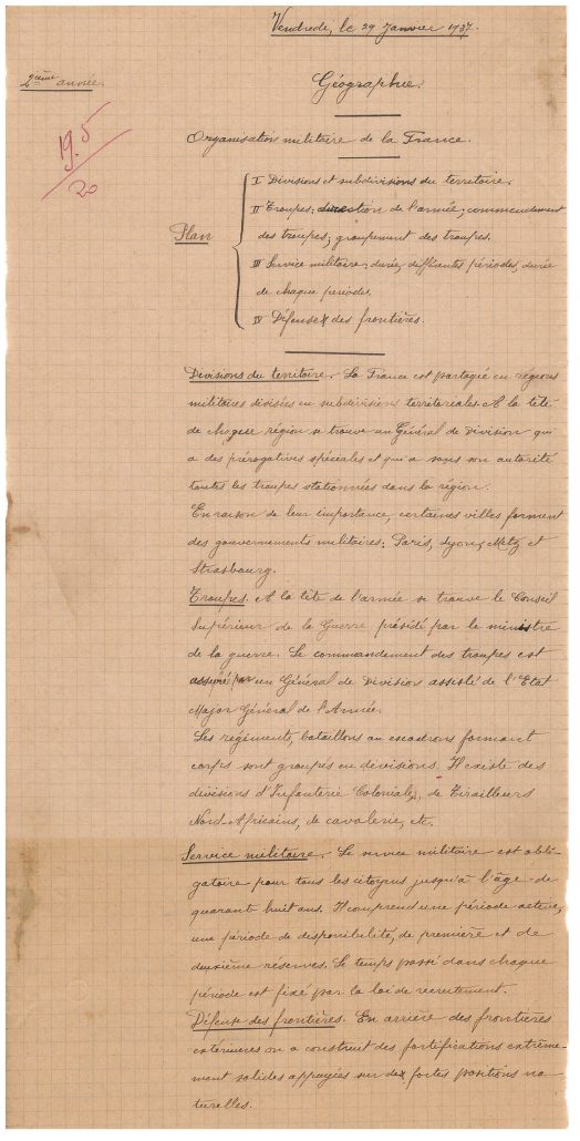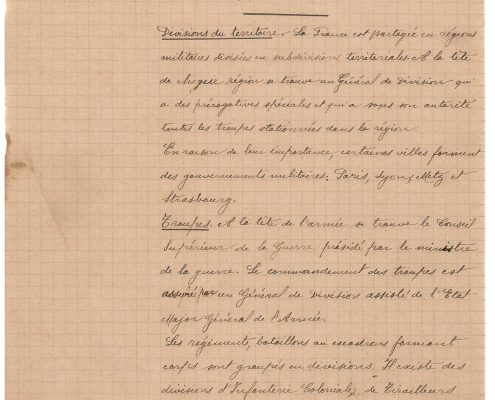 Dans ses archives privées ont été retrouvés des devoirs rédigés pendant ses années d’étude à Fréjus. A leur lecture, la première chose qui nous a frappé a été leur qualité d’écriture et de rédaction. Alors âgé de 27 ans, le jeune sous-officier Africain mène la langue française avec une dextérité qui ferait rougir bon nombre d’élèves de 2014.